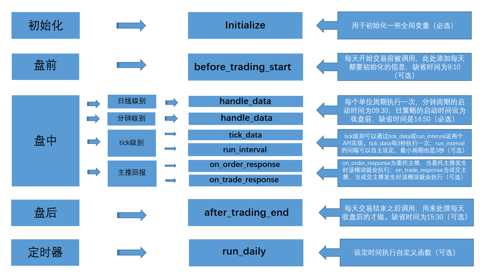 9:31(回测)/9:30(交易)~15:00分钟为盘中运行时间,分钟级别回测环境和交易环境支持运行在run_daily中指定交易时间(如time='14:30')运行的函数;回测环境和交易环境支持运行handle_data函数;交易环境支持运行run_interval函数和tick_data函数