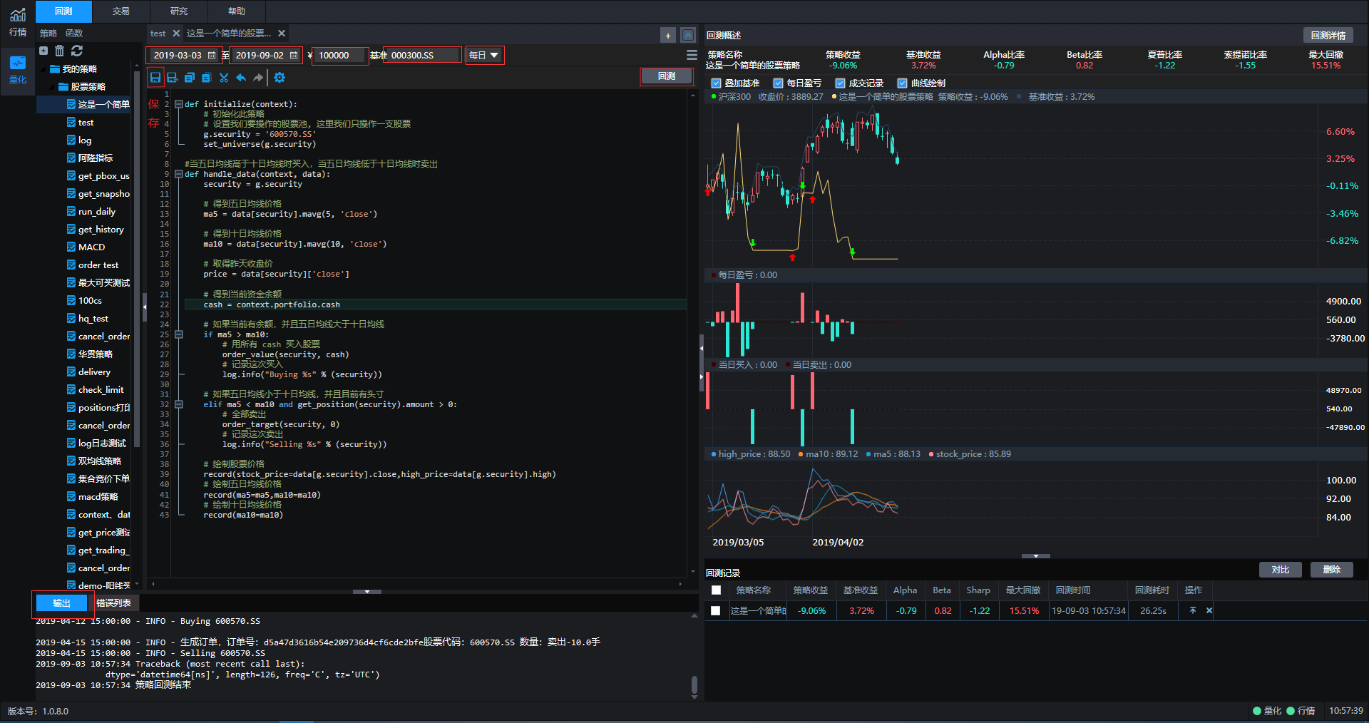 策略添加完成后就可以开始进行回测操作了。回测之前需要对开始时间、结束时间、回测资金、回测基准、回测频率几个要素进行设定,设定完毕后点击保存。然后再点击回测按键,系统就会开始运行回测,回测的评价指标、收益曲线、日志都会在界面中展现。