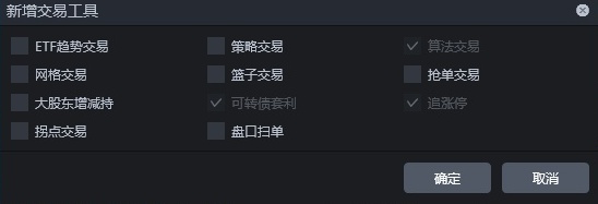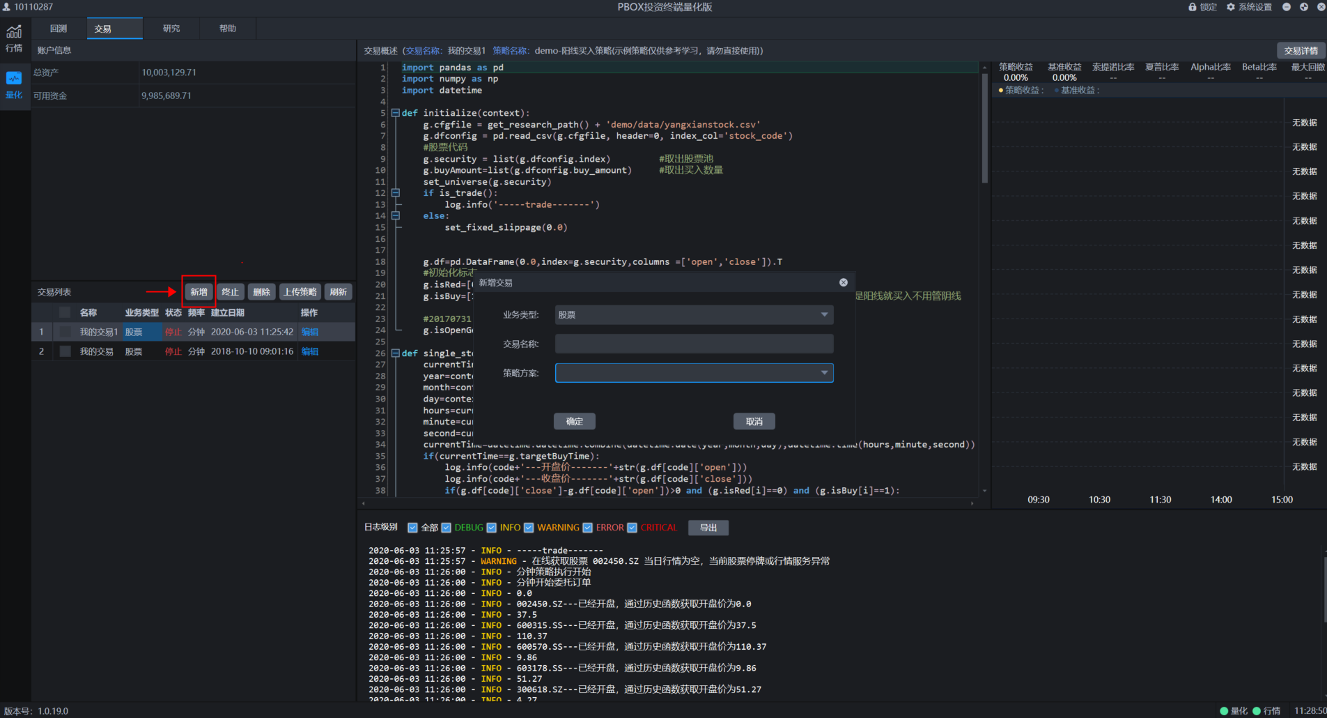 交易界面点击新增按键进行新增交易操作,策略方案中的对象为所有策略列表中的策略,给本次交易设定名称并点击确定后系统就开始运行交易了。